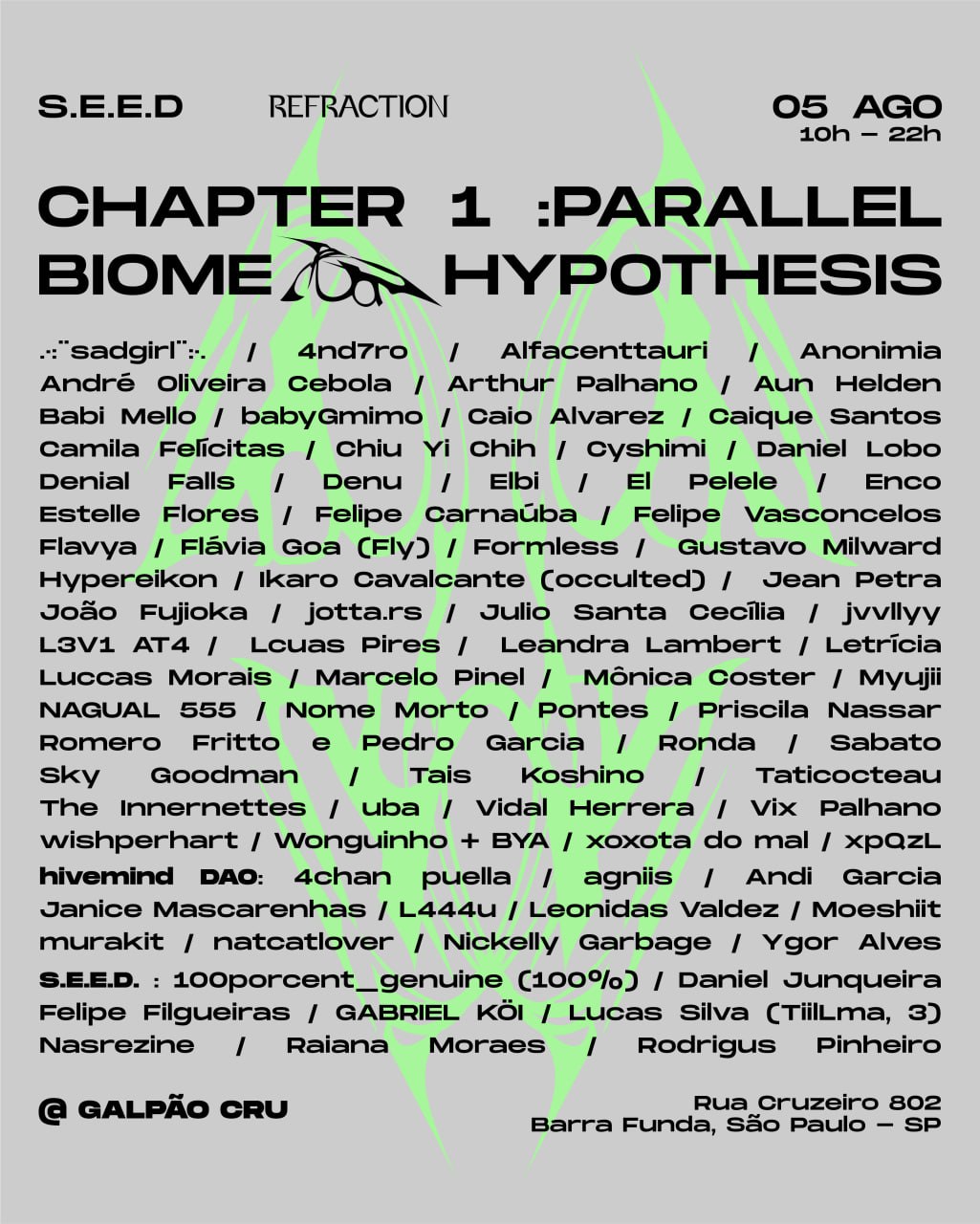 Chapter 1: Parallel Biome Hypothesis is a collective exhibition experience project proposed by the S.E.E.D. group, funded by the Creative Grants Program of Refraction DAO in 2023. Conceived over approximately 1 year, the exhibition took place on August 5th, 2023, in the city of São Paulo, at Galpão CRU (R. Cruzeiro, 802, Barra Funda, São Paulo, Brazil).