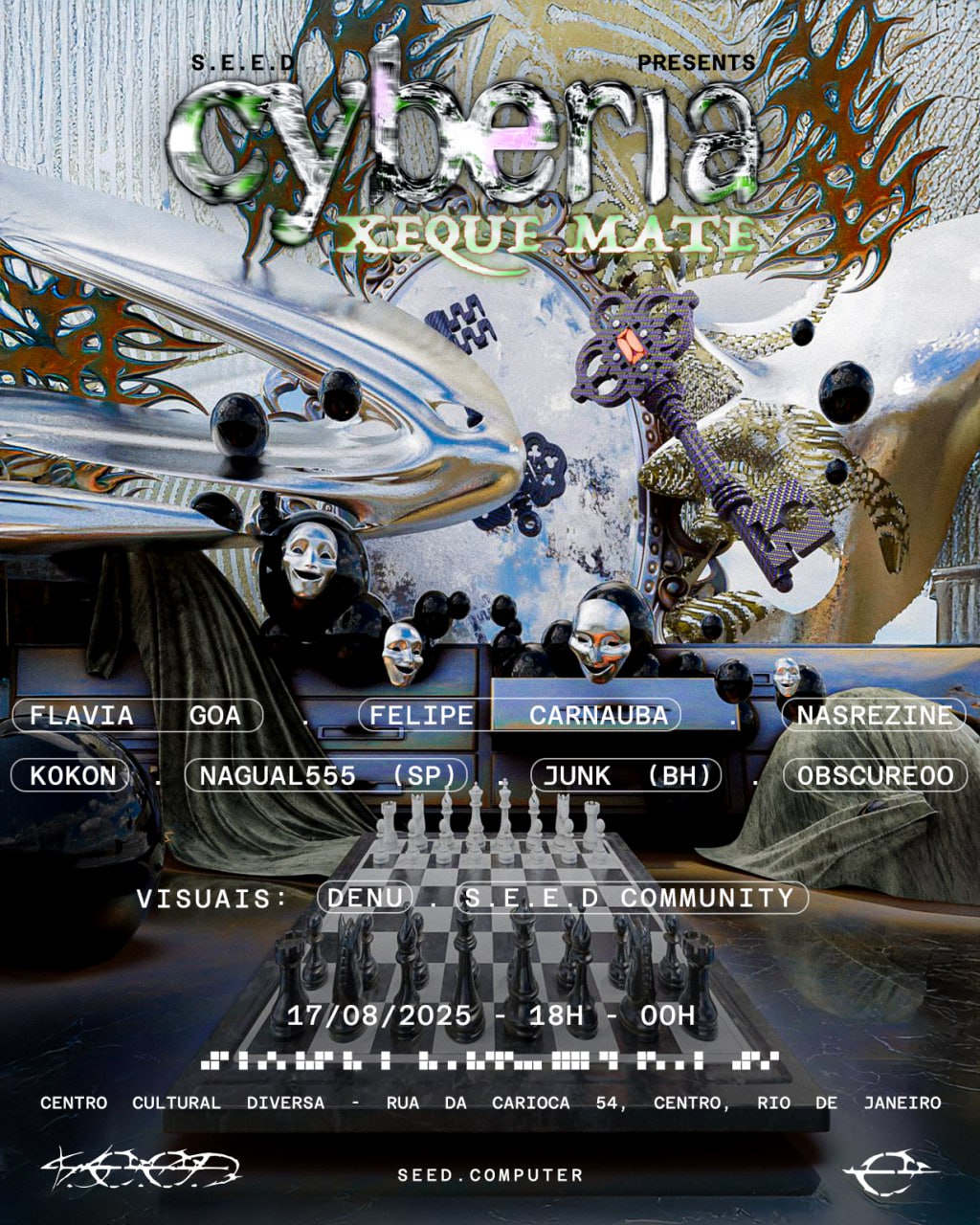 CYBERIA XEQUE MATE é um evento performativo organizado pela SEED, coletivo interdisciplinar de artistas que atuam na interseção entre arte, tecnologia e linguagem digital. Realizado no Rio de Janeiro, o evento propõe a fusão entre festa, performance e jogo, erguendo um tabuleiro vivo de xadrez ao centro da pista, que se transforma em um campo de encontro e ritualização, onde o raciocínio, o corpo e o som se entrelaçam em uma dramaturgia expandida.